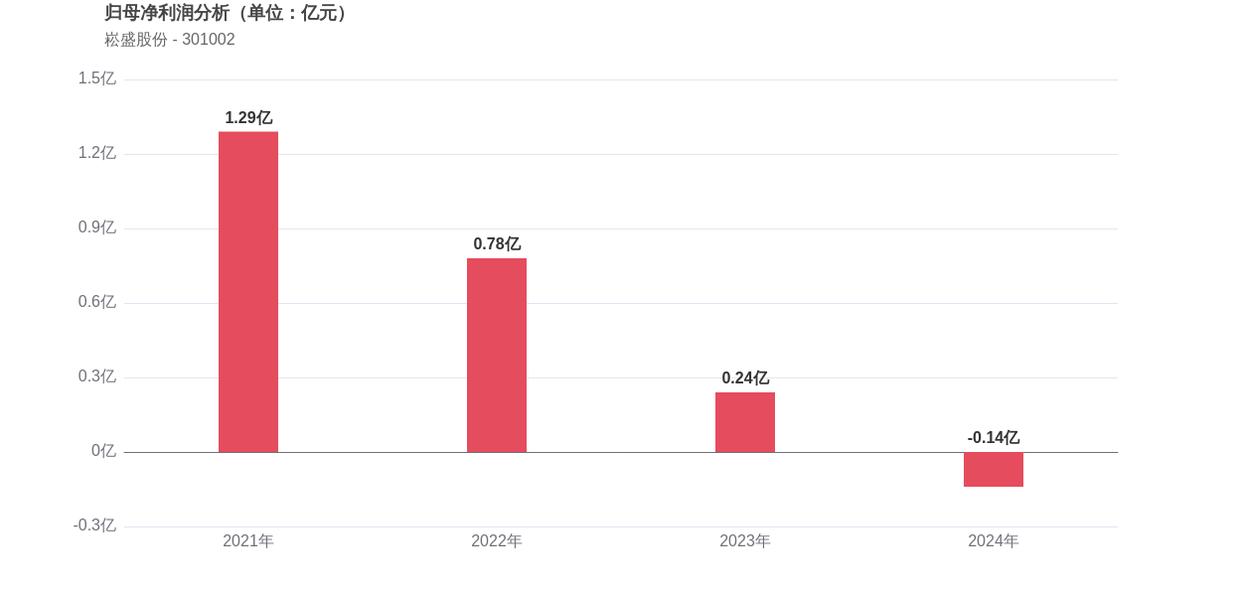 利润角度分析,2021年崧盛股份实现归母净利润1.29亿元,2024年-0.14亿元。公司已从盈利转为亏损状态。