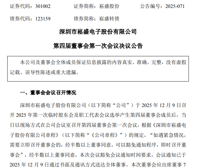 12月10日, 崧盛股份 (301002)连续发布多条公告,涵盖高层人事变动,申请担保等,详情如下: