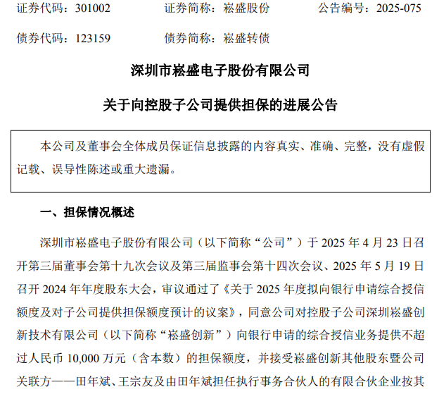 从同日发布的《关于向控股子公司提供担保的进展公告》获悉,近日, 崧盛股份 与 杭州银行深圳分行 签订《 杭州银行股份有限公司 最高额保证合同》,公司为崧盛创新与杭州银行签订的最高融资余额为人民币1000万元的《综合授信额度合同》及其项下单笔业务提供连带责任保证。