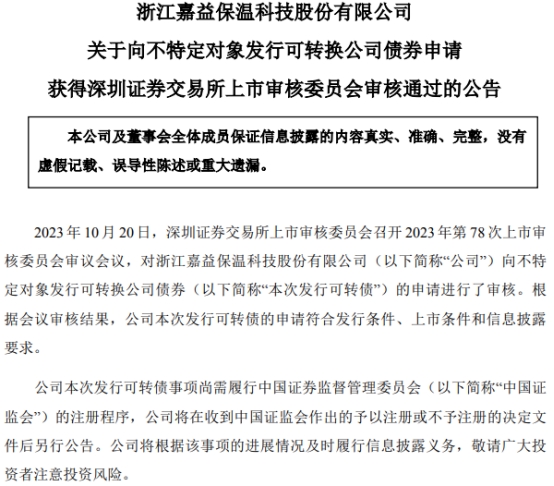10月20日,嘉益股份(301004.SZ)发布公告称,深交所上市审核委员会召开2023年第78次上市审核委员会审议会议,对公司向不特定对象发行可转换公司债券的申请进行了审核。根据会议审核结果,公司本次发行可转债的申请符合发行条件、上市条件和信息披露要求。