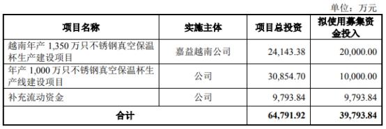 9月14日,嘉益股份发布向不特定对象发行可转换公司债券募集说明书(上会稿),本次向不特定对象发行可转债募集资金总额不超过39,793.84万元,扣除发行费用后全部用于以下项目:越南年产1,350万只不锈钢真空保温杯生产建设项目、年产1,000万只不锈钢真空保温杯生产线建设项目、补充流动资金。