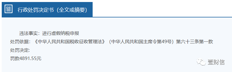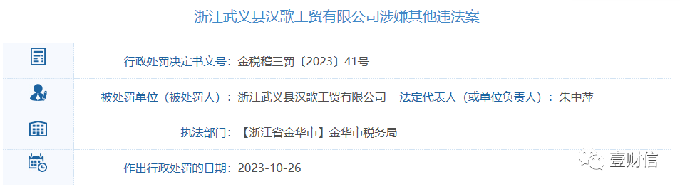 浙江武义县汉歌工贸有限公司(下称“汉歌工贸”)是2019年7月成立的全资子公司,主要从事批发贸易业务。因存在虚假纳税申报的违法行为,2023年10月26日,浙江省金华市税务局对汉歌工贸作出行政处罚,罚款4,891.55元。
