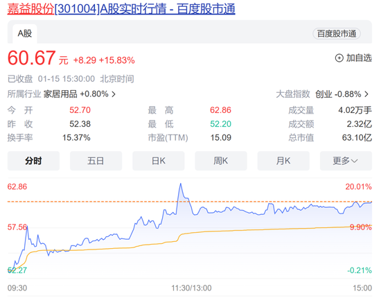 1月15日,嘉益股份(301004)股票开盘后快速拉升,盘中一度达62.86元/股。截至15日下午收盘,公司股价报收于60.67元/股(日涨幅为15.83%),创下公司股票自2021年6月25日上市以来的新高。