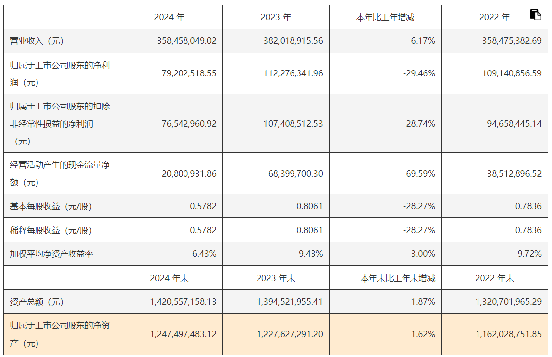 2024年,迈拓股份实现营业收入为358,458,049.02元,相较于2023年的382,018,915.56元,下降了6.17%。归属于上市公司股东的净利润为79,202,518.55元,与2023年的112,276,341.96元相比,减少了29.46%。归属于上市公司股东的扣除非经常性损益的净利润为76,542,960.92元,较2023年的107,408,512.53元下降28.74%。