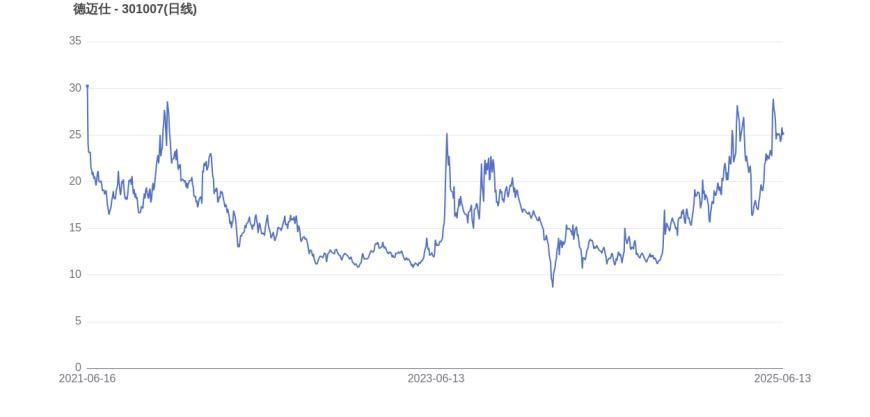2021年6月16日,德迈仕的市值巅峰达到48.01亿元,股价也顺应升至31.31元。而至6月13日收盘,德迈仕的股价为25.15元,市值为38.56亿元,相比峰值时期市值减少9.45亿元,市值蒸发了19.67%。