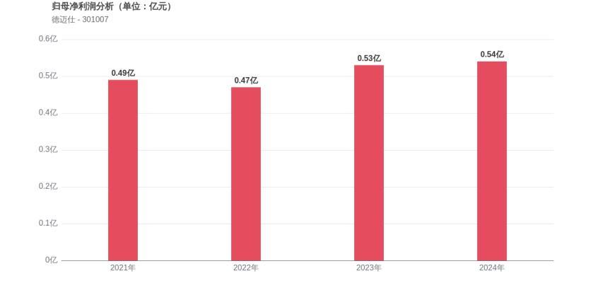 利润角度分析,2021年德迈仕实现归母净利润0.49亿元,2024年0.54亿元。公司净利润增长相对温和,盈利能力有待进一步提升。
