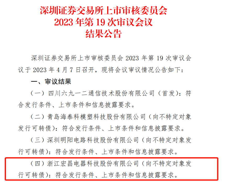2023年4月9日,经深圳证券交易所上市审核委员会2023年第19次审议会议审核,浙江宏昌电器科技股份有限公司(股票代码:301008,股票简称“宏昌科技”)向不特定对象发行可转债的申请顺利通过!
