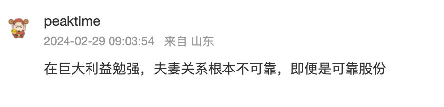 有投资者表示,"在巨大利益面前,夫妻关系根本不可靠,即便是可靠股份。"