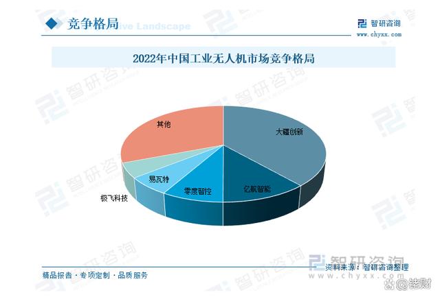 据智研咨询,在整个无人机市场占比中,工业级无人机约占40%,市场规模较小。2022年中国工业无人机市场份额排名前五的为大疆创新、亿航智能、零度智控、易瓦特和极飞科技,市场份额为38.7%、11.5%、8.2%、6.0%、4.9%。
