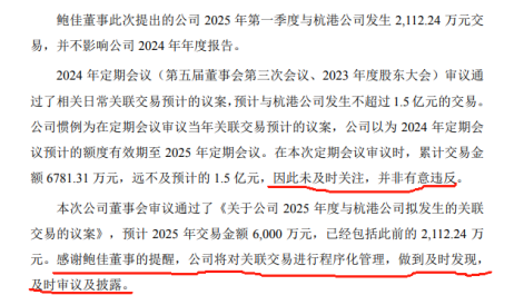 事实上,在第五届董事会第九次会议上,鲍佳就对《关于公司 2025年度与杭港公司拟发生的关联交易的议案》投出反对票。2025年第一季度可靠股份与杭港公司发生2112.24万元交易,该数额已超法定比例但未经过审议,在此背景下,鲍佳以“多次提出关联交易违规要求整改及监管部门采取举措情况下再次公然违反法规,挑战监管红线,未经审议强行交易”为由投出上述反对票。