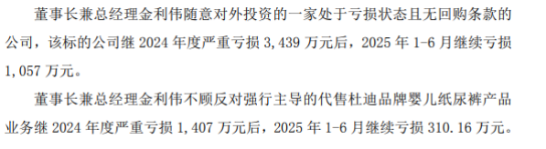 同时,婴儿护理用品领域主要以代工为主,自主品牌杜迪的占比不足10%,且仍在亏损中。这一情况受到了鲍佳强烈批评“董事长兼总经理金利伟不顾反对,强行主导的代售杜迪品牌婴儿纸尿裤产品业务,在2024年严重亏损1407万元,今年上半年继续亏损310.16万元。”