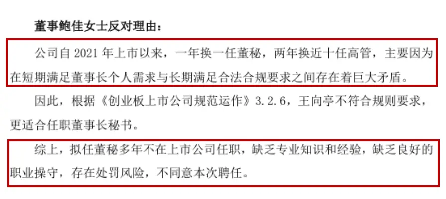 在今年8月审议公司半年报及聘任新董秘等一系列议案的董事会会议上,董事鲍佳再次投出反对票,认为公司董秘更换过于频繁,候选人此前工作失职等,不同意聘任。不过,最终董事会仍以5票赞成,1票反对和1票弃权通过了系列议案。