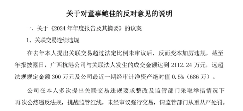 揭示公司这一关联交易合规问题的导火索,或许是4月董事会上的表决分歧。这次董事会上,公司第二大股东、董事鲍佳在审议《2024年年度报告及摘要》以及《关于公司2025年度与杭港公司拟发生的关联交易的议案》时均投出反对票,其明确表示公司关联交易连续违规,需要监管介入。此外,一名独立董事也针对上述关联交易议案发表了弃权意见。