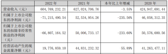 华立科技(301011.SZ)近日披露的2022年年度报告显示,报告期内,公司实现营业收入6.05亿元,同比减少3.55%;实现归属于母公司所有者的净利润-7121.55万元,同比减少235.56%;归属于上市公司股东的扣除非经常性损益的净利润-6680.72万元,同比减少233.60%;经营活动产生的现金流量净额1977.69万元,同比下降55.89%。
