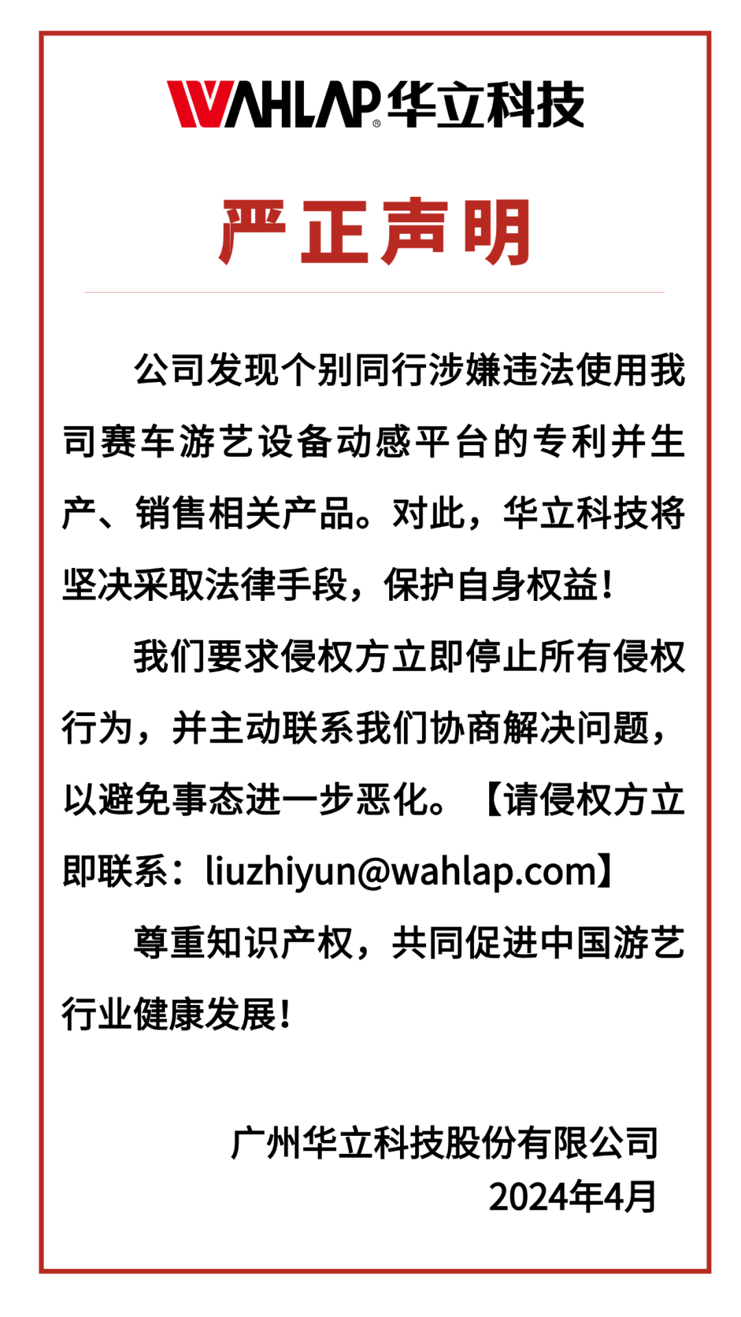 华立科技就赛车游艺设备动感平台侵权行为发表严正声明