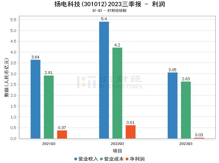 在利润方面,扬电科技2023年三季度报告显示,公司营业收入为3.05亿元,相比上年同期的5.4亿元下降了43.58%。营业成本为2.63亿元,相比上年同期的4.2亿元下降了37.56%。毛利率为13.58%,相比上年同期的22.28%下降了38.96%。净利润为277.86万元,相比上年同期的6147.94万元下降了95.48%。净利率为0.91%,相比上年同期的11.39%下降了92.01%。