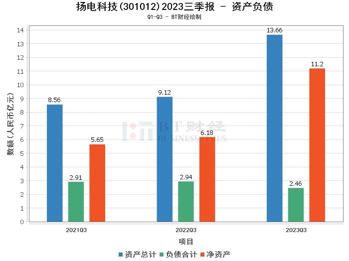 在资产负债方面,扬电科技2023年三季度报告显示,公司资产总计达到13.66亿元,相比上年度末的9.49亿元增长了43.92%。负债合计为2.46亿元,相比上年度末的3.27亿元下降了24.77%。净资产达到11.2亿元,相比上年度末的6.22亿元增长了80.08%。资产负债率为17.98%,相比上年度末的34.45%下降了47.83%。