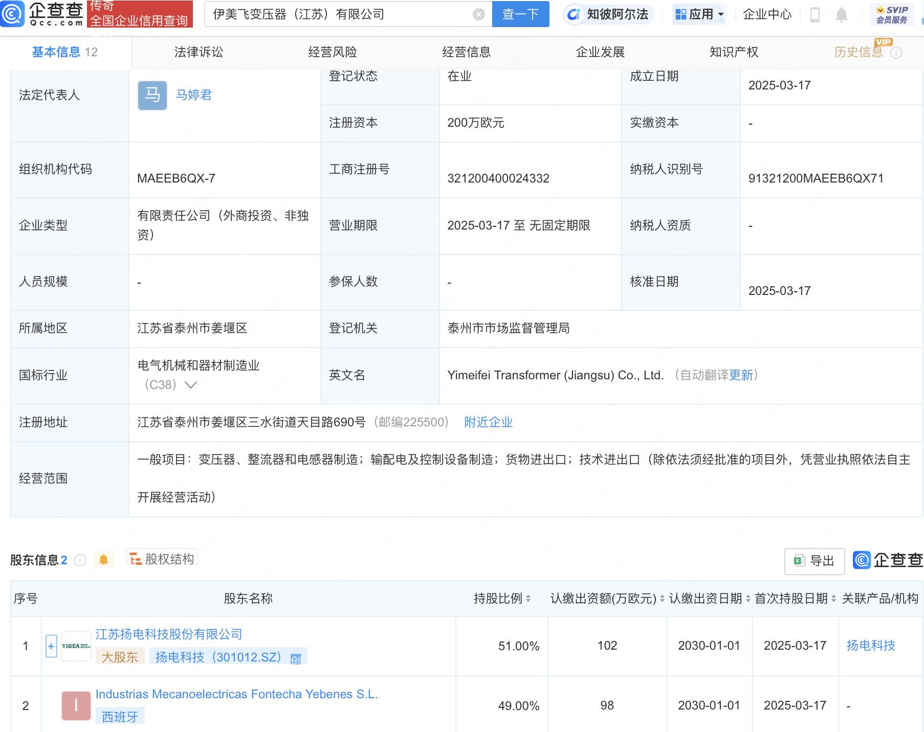 近日,伊美飞变压器(江苏)有限公司成立,法定代表人为马婷君,经营范围包含:变压器、整流器和电感器制造;输配电及控制设备制造;货物进出口;技术进出口。股权穿透显示,该公司由扬电科技(301012)等共同持股。
