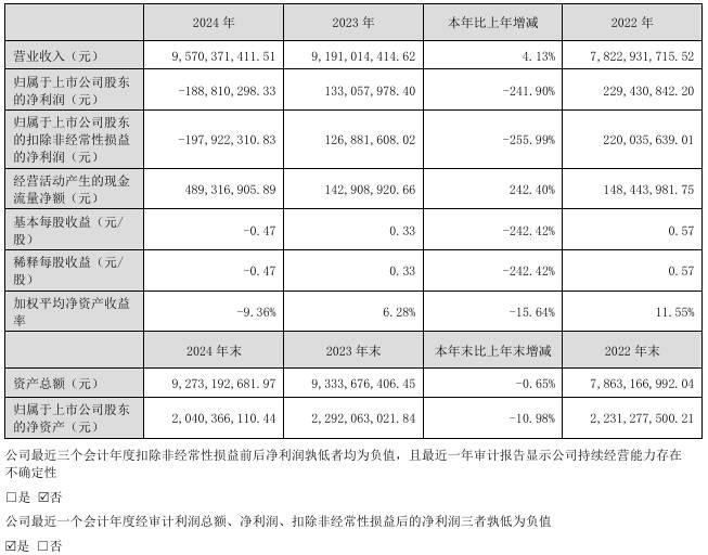 从公布的年报数据来看,公司2024年累计完成营业收入957,037.14万元,同比增长4.13%;归属母公司股东的净利润-18,881.03万元,同比下降241.90%。扣除非经常性损益的净利润则为-19,792.23万元,下降255.99%。