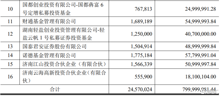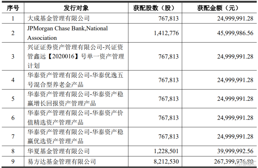 4月3日申菱环境(301018.SZ)披露向特定对象发行股票发行情况报告书,确定此次发行价格为32.56元/股,发行价格为发行底价的111.39%,发行数量2457.0024万股,募集资金总额8亿元,确定此次发行的发行对象及其具体获配股数如下: