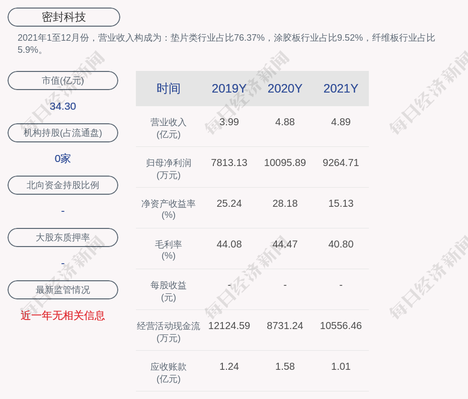 2021年1至12月份,密封科技的营业收入构成为:垫片类行业占比76.37%,涂胶板行业占比9.52%,纤维板行业占比5.9%。
