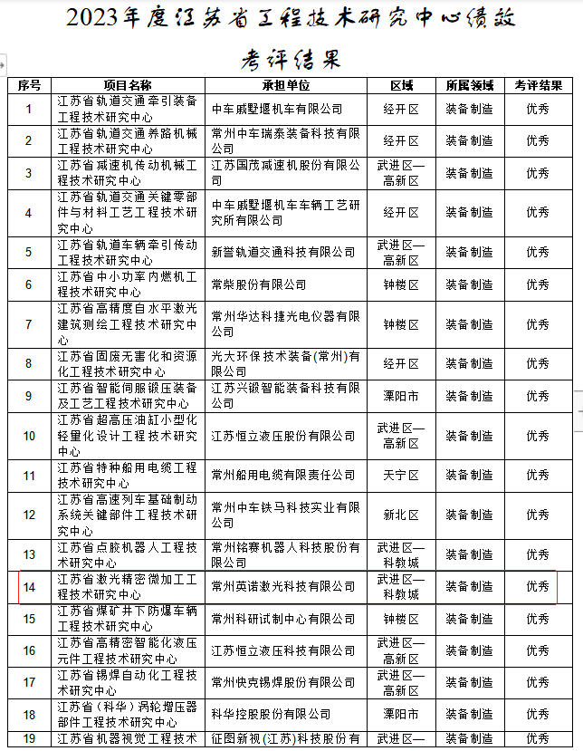 2023年3月31日,常州市科学技术局发布了《关于2023年度江苏省工程技术研究中心绩效考评结果的公示》,英诺激光全资子公司常州英诺激光科技有限公司经过材料申报、常州市科技局形式审查、专家评审、尽职调查等流程,从全市抽查的155家省级工程技术研究中心中脱颖而出,绩效考评获得“优秀”认定,现已完成公示。