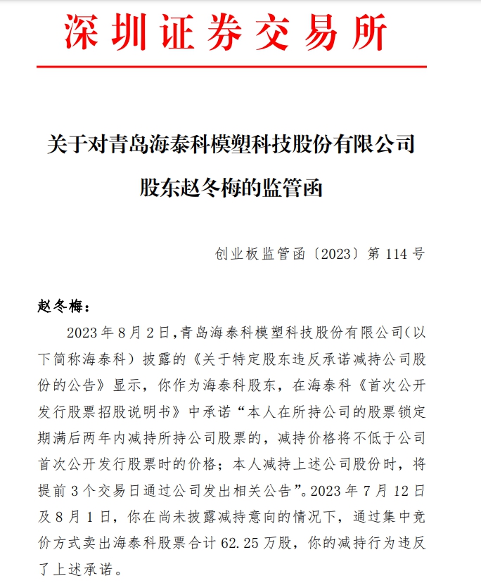 监管函显示,8月2日,海泰科披露的《关于特定股东违反承诺减持公司股份的公告》显示,赵冬梅作为海泰科股东,在海泰科《首次公开发行股票招股说明书》中承诺“本人在所持公司的股票锁定期满后两年内减持所持公司股票的,减持价格将不低于公司首次公开发行股票时的价格;本人减持上述公司股份时,将提前3个交易日通过公司发出相关公告”。