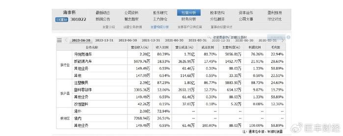 截至2023年6月30日,按行业来看,传统燃油车营业收入为2.20亿,收入比例为80.39%;新能源汽车营业收入为5079.76万,收入比例为18.53%。按产品来看,注塑模具营业收入2.39亿,收入比例为87.25%;塑料零部件营业收入为3305.36万,收入比例为12.06%。