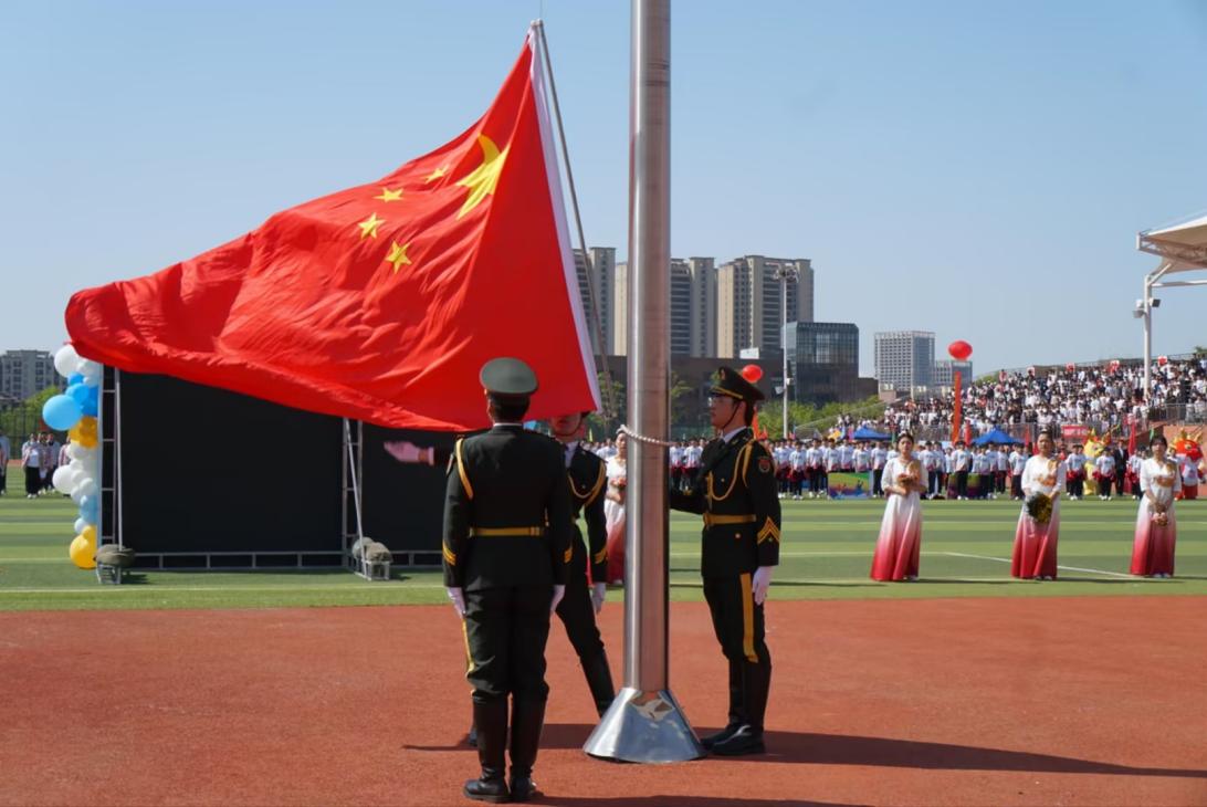 升旗仪式环节,全体起立,升国旗,奏国歌。五星红旗缓缓上升,随风飘扬,全体师生目光如炬。