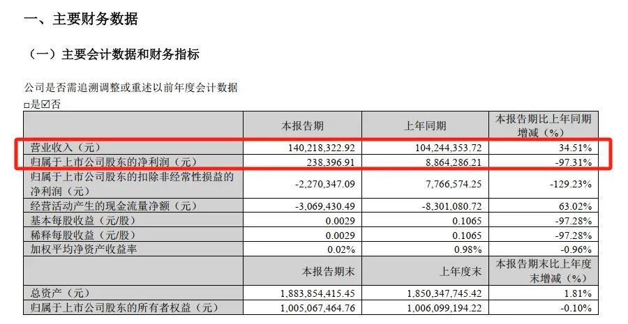 2024年一季度,海泰科“增收不增利”情况延续,且归母净利润下降幅度持续拉大。一季度,海泰科实现营业收入1.40亿元,同比增长34.1%;实现归母净利润23.84万元,同比下降97.31%;实现总资产18.84亿元,同比增长1.81%。营业收入增长主要系本报告期模具达到验收状态,确认收入增加所致。