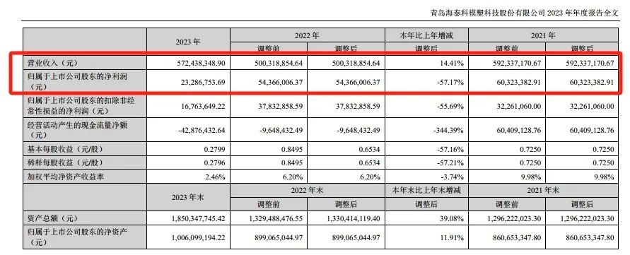 6月4日,青岛海泰科模塑科技股份有限公司(以下简称“海泰科”)发布公告,因未及时披露2023年年报业绩预告,一天内收到深交所、青岛证监局出具的两张监管函。回顾2023年,在营业收入增长的同时,海泰科归属于上市公司股东的净利润(以下简称“归母净利润”)同比下降57.17%。而一季度,“增收不增利”情况延续,归母净利润同比下降97.31%。