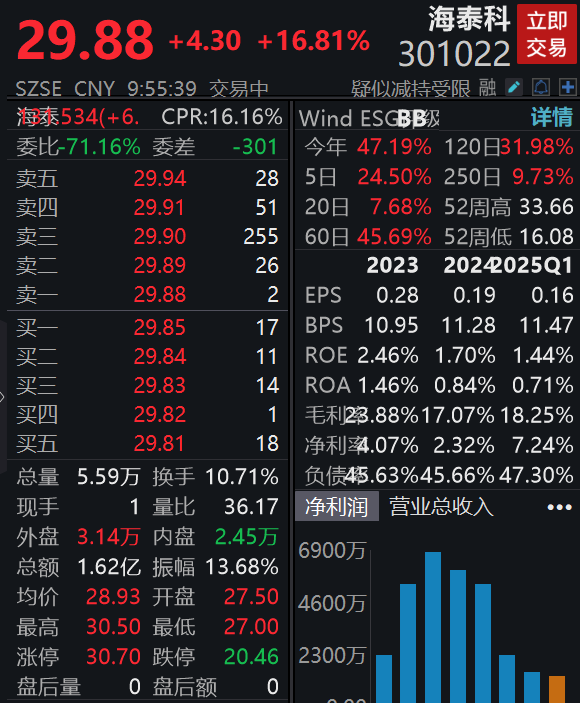 4月24日,海泰科高开高走,截至发稿,该股大涨16.81%,报29.88元,成交额1.62亿元。