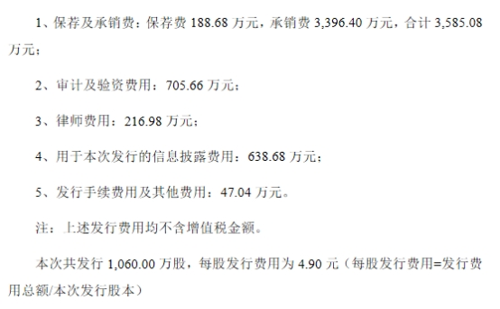 霍普股份上市发行费用为5193.44万元,其中保荐机构长江证券承销保荐有限公司获得保荐及承销费3585.08万元。
