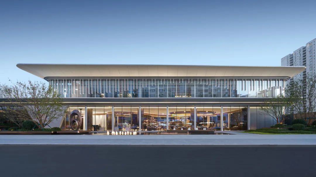 示范区以“引千年汾河水,筑太原新未来"为设计理念,将汾河江水曲线的柔美与建筑形式相融合,创造出富有动感、张力的流动场景,将体验延展向未来,将无限的遐想隐于其中,仿佛使人身临其境地品味这场引领太原走向未来的"焕新体验”。流畅的曲线,仪式感的大堂,通透的玻璃幕墙,为室内提供了充足的自然采光,营造出大气庄重的氛围,为居者创造归家时的仪式感与未来感。
