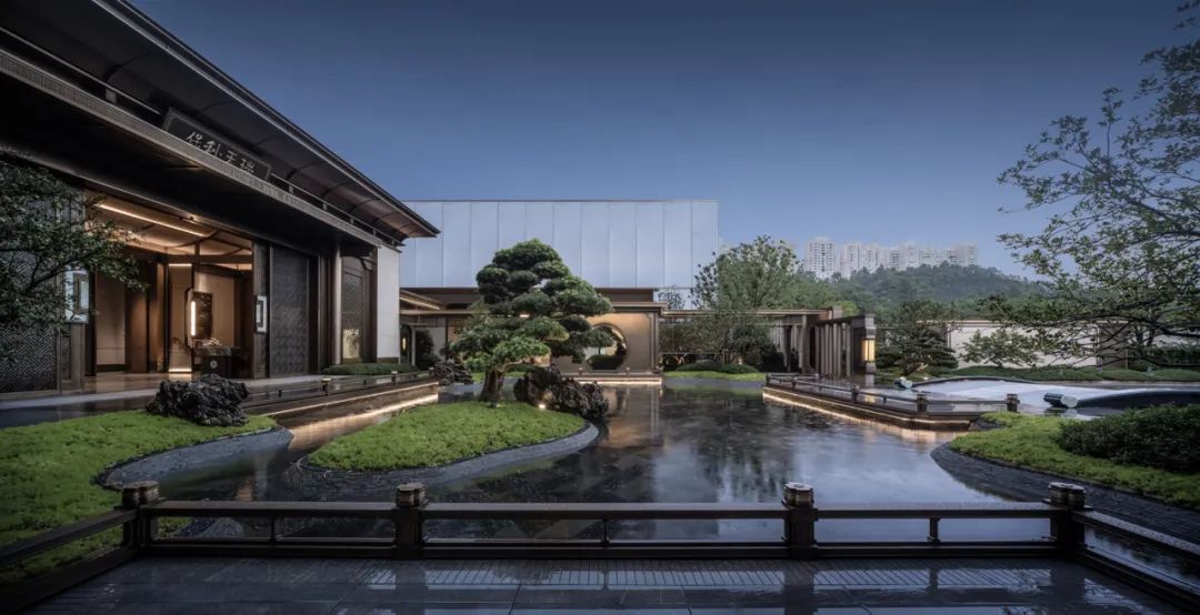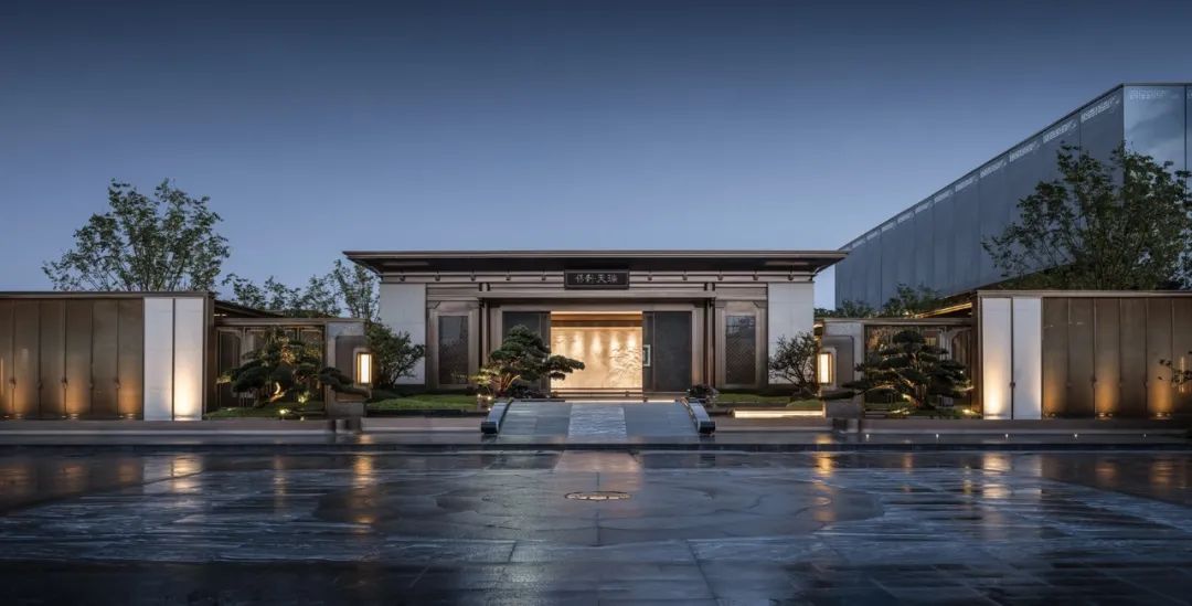 “一轴对称,五序体验”,设计以中轴对称形制进行院落布局,尽显府院的东方美学大境。历史建筑被巧妙地用作售楼处,用现代主义元素美感的金属线条勾勒轮廓,用反曲线表达飞檐,用大面积古铜色不锈钢给传统的建筑面貌赋予了一个干净利落且时尚的妆容。