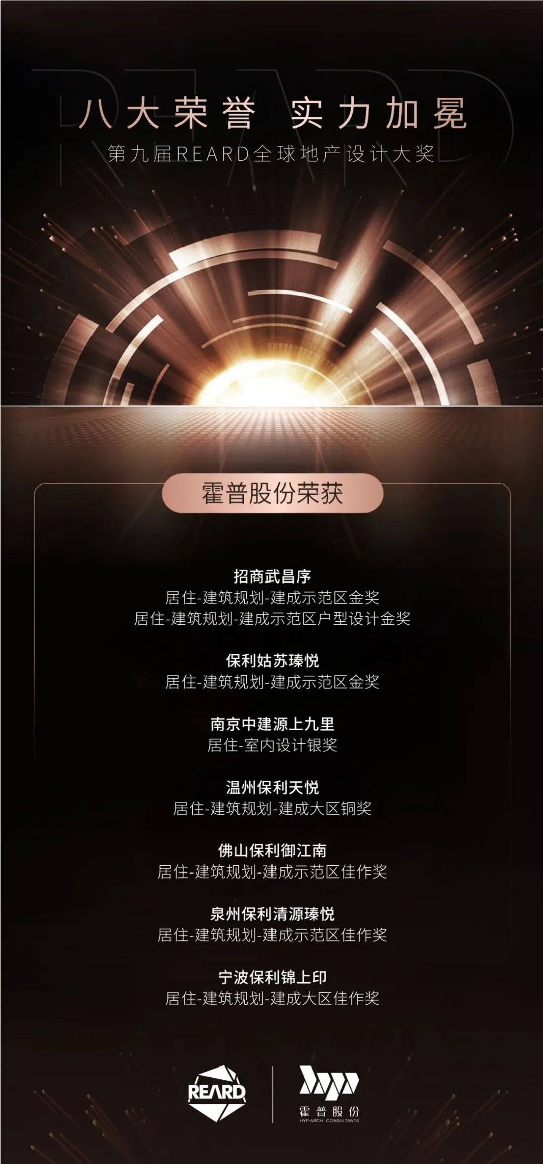 霍普股份此次荣膺 2024 年度第九届 REARD 全球地产设计大奖 8 项荣誉,含 3 金 1 银 1 铜 3 佳作。