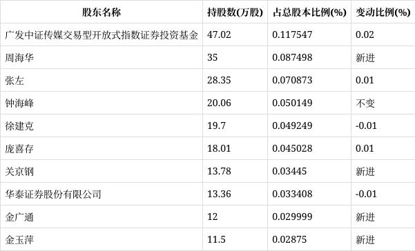 半年报显示,2022年上半年末的公司十大流通股东中,新进股东为周海华、关京钢、金广通、金玉萍,取代了一季度末的刘素杰、中信建投量化进取6个月持有期混合型证券投资基金、基本养老保险基金一三零二组合、汪雪林。在具体持股比例上,广发中证传媒交易型开放式指数证券投资基金、张左、庞喜存持股有所上升,徐建克、华泰证券股份有限公司持股有所下降。