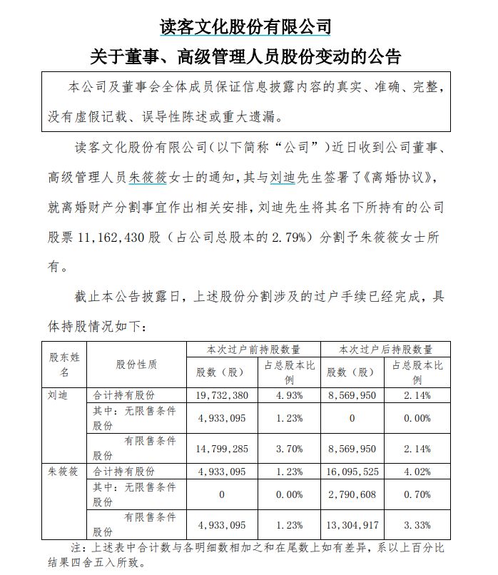 9月22日晚间,读客文化发布公告称,公司近日收到董事、高级管理人员朱筱筱的通知,其与刘迪签署了《离婚协议》,就离婚财产分割事宜作出相关安排,刘迪将其名下所持有的公司股票1116.24万股(占公司总股本的2.79%)分割予朱筱筱所有。