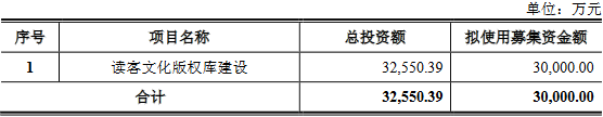 本次发行读客文化拟募集资金总额不超过30,000.00万元(含30,000.00万元),扣除发行费用后的募集资金净额,拟用于读客文化版权库建设。