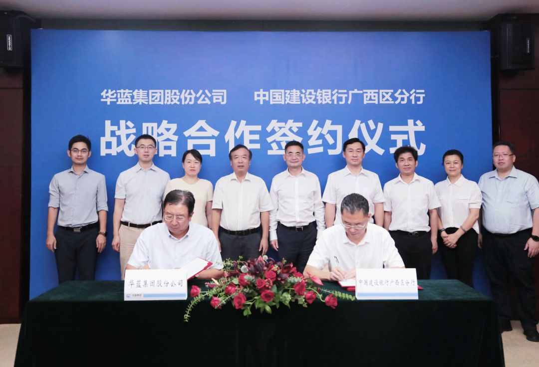2022年8月4日下午,华蓝集团与中国建设银行广西区分行在南国弈园签署战略合作协议。华蓝集团党委书记、董事长雷翔,建设银行广西区分行党委书记、行长方建平等领导出席了签约仪式。华蓝集团股份公司副总经理赵成、中国建设银行广西区分行副行长张石强分别代表双方在战略合作协议上签字。