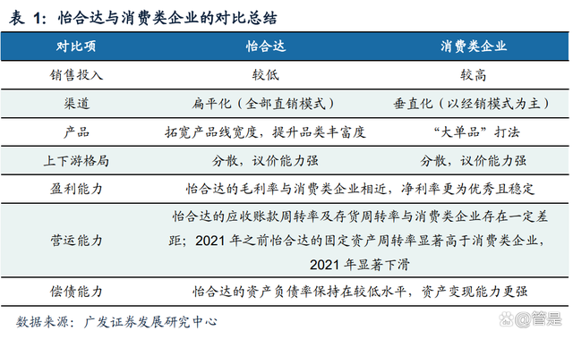 怡合达与典型的消费品企业的共同点在于上下游格局分散,在产业链中的议价能力较强,长时间保持了较强的盈利能力。不同点在于:(1)怡合达的销售投入相对较低。这主要是由于消费类企业品牌认可度的建立更多是从营销端发力,让产品在目标消费群体中得到最大化曝光,而怡合达品牌认可度的建立更多依赖于客户工程师使用习惯的培养、客户粘性的形成。