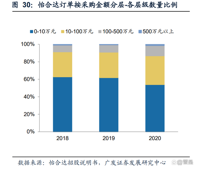 线上线下双渠道各司其职,多方位满足不同层次需求。从下游客户分布来看,线上渠道主要面向小微型客户,2018-2020年0-10万元的订单占比分别为67.36%、60.48%及38.66%;线下渠道的订单分布则更为分散且呈现出大客化趋势,2020年400万元以上的订单所占比重最高,达22.40%。