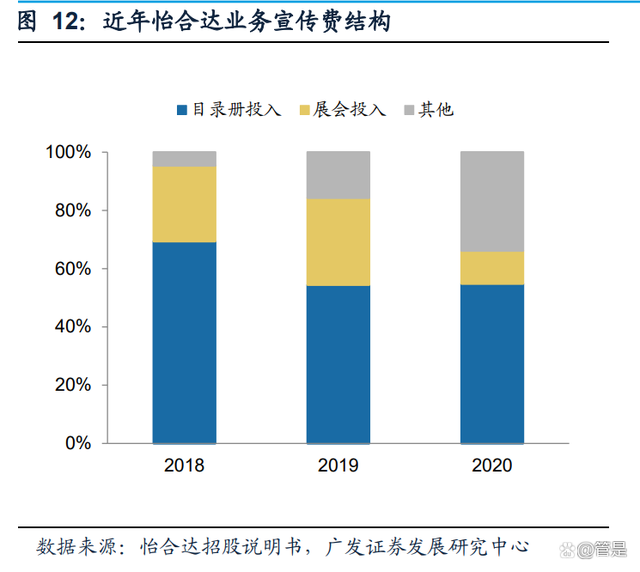 (3)终端使用者的不同决定了怡合达的业务宣传成本天然较低。消费类企业直接面向普通消费者,业务宣传模式包括社交媒体投放流量、代言人推广等;对比之下,怡合达面向的是自动化设备厂商和终端设备使用厂商,业务宣传模式以向工程师发放产品目录手册、展会投入等形式为主。根据怡合达招股说明书,2018-2020年,产品目录手册及展会投入在业务宣传费中的占比分别为95.41%、84.34%及66.20%。