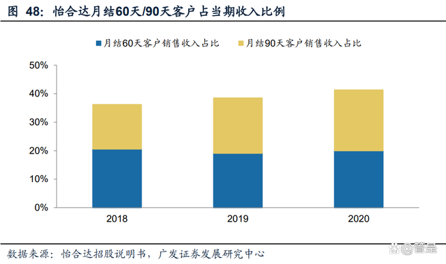 应收账款周转率与消费类企业相比差距明显。2017-2021年,怡合达的应收账款周转率分别为5.60、6.13、4.93、5.93及5.90,与同期消费类企业样本公司的平均值相比差距明显,这主要是由于消费类企业一般对下游经销商具有较强的议价权,结算方式以先款后货为主,因此资金回笼及时,应收账款账面余额较低。而怡合达的销售模式均为直接销售,且公司对部分客户会给予一定的账期。2018-2020年,怡合达月结60天和月结90天信用期的客户所对应的销售收入占比分别为36.15%、38.46%及 41.27%。公司40%左右的销售收入来源于应收账款,导致公司应收账款账面余额较大,与消费类企业相比应收账款周转率偏低,这也是制造企业的通行做法。