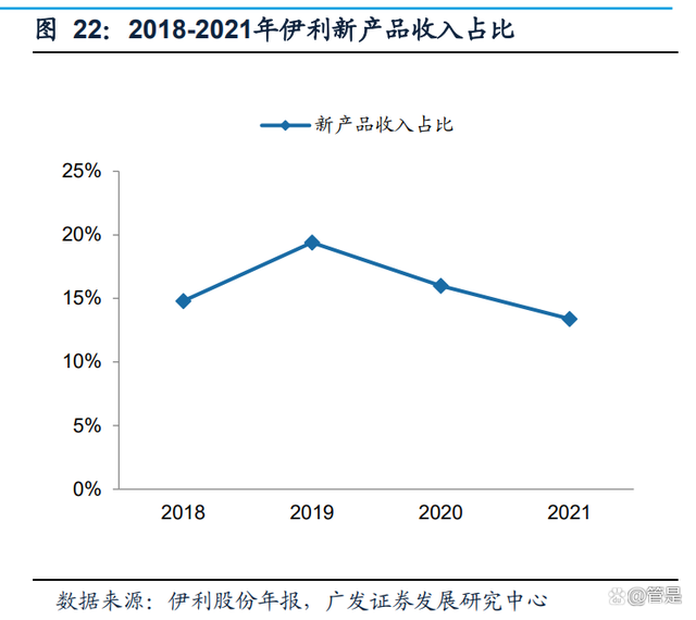 为吸引更多消费者、抢占更高市占率,消费行业的头部企业通常具备持续性地丰富与拓展产品品类的能力。以伊利为例,通过持续产品创新与技术突破,伊利持续拓宽产品矩阵,现已形成液体乳、乳饮料、奶粉、酸奶、冷冻饮品、奶酪、乳脂、包装饮用水等八大产品系列,几乎覆盖了乳制品行业中所有的方向。根据伊利股份年报, 2018-2021年,伊利新产品收入占比分别为14.8%、19.40%、16.00%及13.4%,稳定在15%左右,强大的产品开发能力为伊利的业务发展倾注了蓬勃活力。