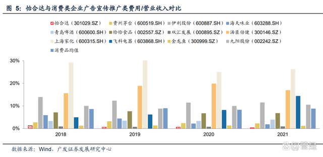进一步研究销售费用的具体构成可以发现,怡合达的销售费用主要由职工薪酬构成,据怡合达2021年年报,2021年业务宣传费在销售费用中的占比仅为7.01%。此外,与消费类企业相比,2018-2021年怡合达业务宣传费用在营业收入中的占比分别为 1.35%、0.59%、0.61%及0.34%,大幅低于同期消费类企业样本公司的平均值8.56%、 8.91%、8.23%及8.72%。