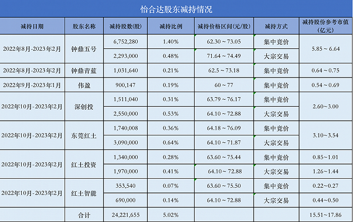 实际上,怡合达原始股东们刚完成一轮大笔套现。据公司近日公告,过去的半年时间里,包括深圳市创新投资集团有限公司(简称“深创投”)在内的共7名股东持续“抛售”公司股票,仅以公告披露的减持区间股价最低价计算,该轮减持金额合计已将近16亿元。