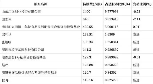 2023年一季度末的公司十大流通股东中,新进股东为邱利华、张熠临、深圳市核子基因科技有限公司、赵芹、浦银安盛品质优选混合型证券投资基金、程飞,取代了此前的博时汇融回报一年持有期混合型证券投资基金、青骊汇川3号私募证券投资基金、博时汇荣回报灵活配置混合型证券投资基金、浦银安盛新经济结构灵活配置混合型证券投资基金、浦泓总回报私募证券投资基金、吴二媛。在具体持股比例上,博时汇兴回报一年持有期灵活配置混合型证券投资基金持股有所上升,山东江诣创业投资有限公司、田志伟、鼎森启贤8号私募证券投资基金持股有所下降。