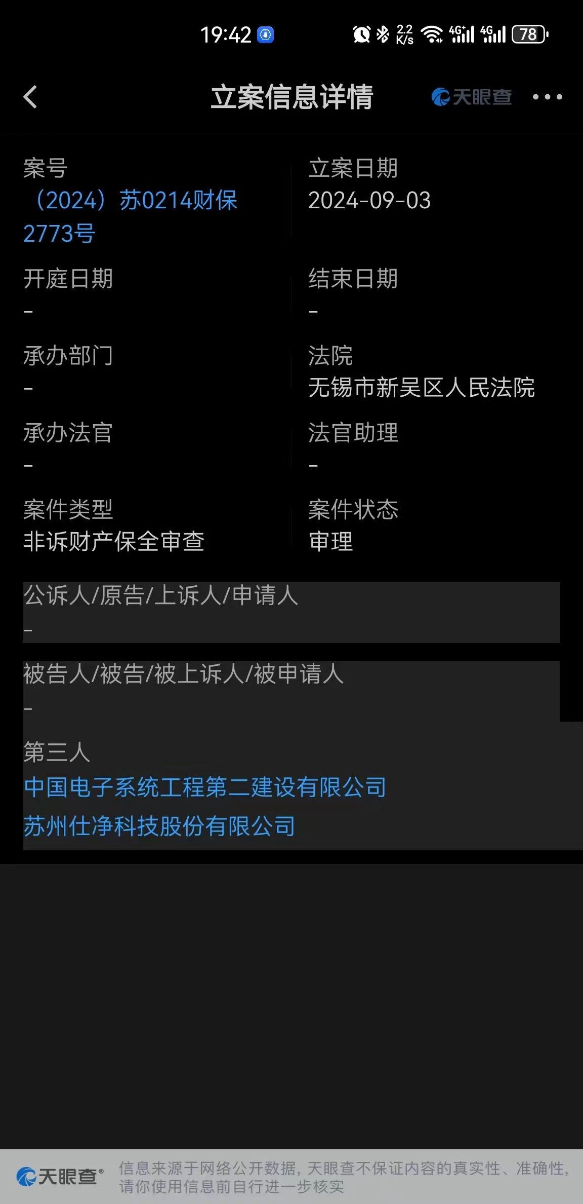 2019年,仕净环保因买卖合同纠纷,被江苏省苏州市相城区人民法院裁定冻结银行存款153,615元。月余后,仕净环保再次因建设工程施工合同纠纷被起诉,苏州市城南建筑安装工程有限责任公司要求冻结仕净环保名下的银行存款120万元。法院最终支持了这一申请,并裁定冻结了相应金额的银行存款。