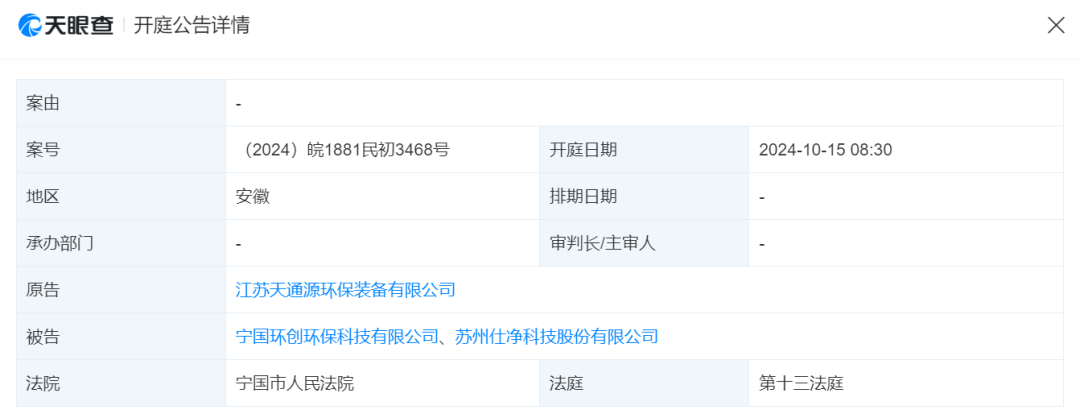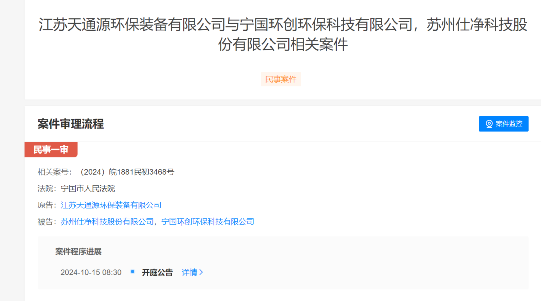 据了解,该案件原告为江苏天通源环保装备有限公司,被告为宁国环创环保科技有限公司、苏州仕净科技股份有限公司,此案件于10月15日开庭,审理法院为宁国市人民法院。